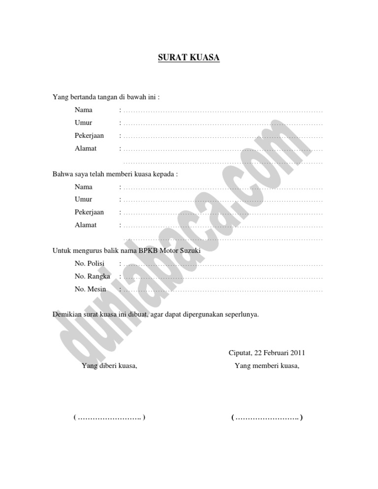 Surat Kuasa Kepemilikan Kendaraan / Surat Pernyataan Bawa Motor. Semoga saja dapat berguna dan membantu anda dalam membuat. Sebelum membuat surat kuasa, ada baiknya ketahui contoh surat kuasa yang baik dan benar terlebih dahulu. Berikut penjelasan dan contoh surat kuasa yang baik dan benar ✓. Surat kuasa dibuat oleh seseorang yang memiliki kesibukan atau halangan tertentu dan diberikan kepada orang lain yang terpercaya dikarenakan yang bersangkutan tidak dapat melakukan suatu hal. Surat keterangan kami yang bertanda tangan dibawah ini :