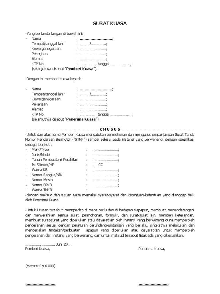 Dengan menggunakan surat kuasa ini maka tidak akan ada keraguan terhadap si penerima kuasa. Contoh surat kuasa perwakilan memang kerap kali dibutuhkan saat seorang tidak bisa melakukan secara langsung sebuah pekerjaan namun masih tetap menginginkan pekerjaan/suatu hal itu bisa tetap dapat dilakukan atau terwujud. Bpkb atau bukti kepemilikan kendaraan bermotor merupakan salah satu dokumen penting yang harus dimiliki oleh semua pemilik kendaraan bermotor. Jika motor baru berarti itu adalah bpkb yang pertama atau baru, sedang jika bekas maka perlu pindah nama kepemilikan dahulu. Wa ode nurbay nomor ktp :